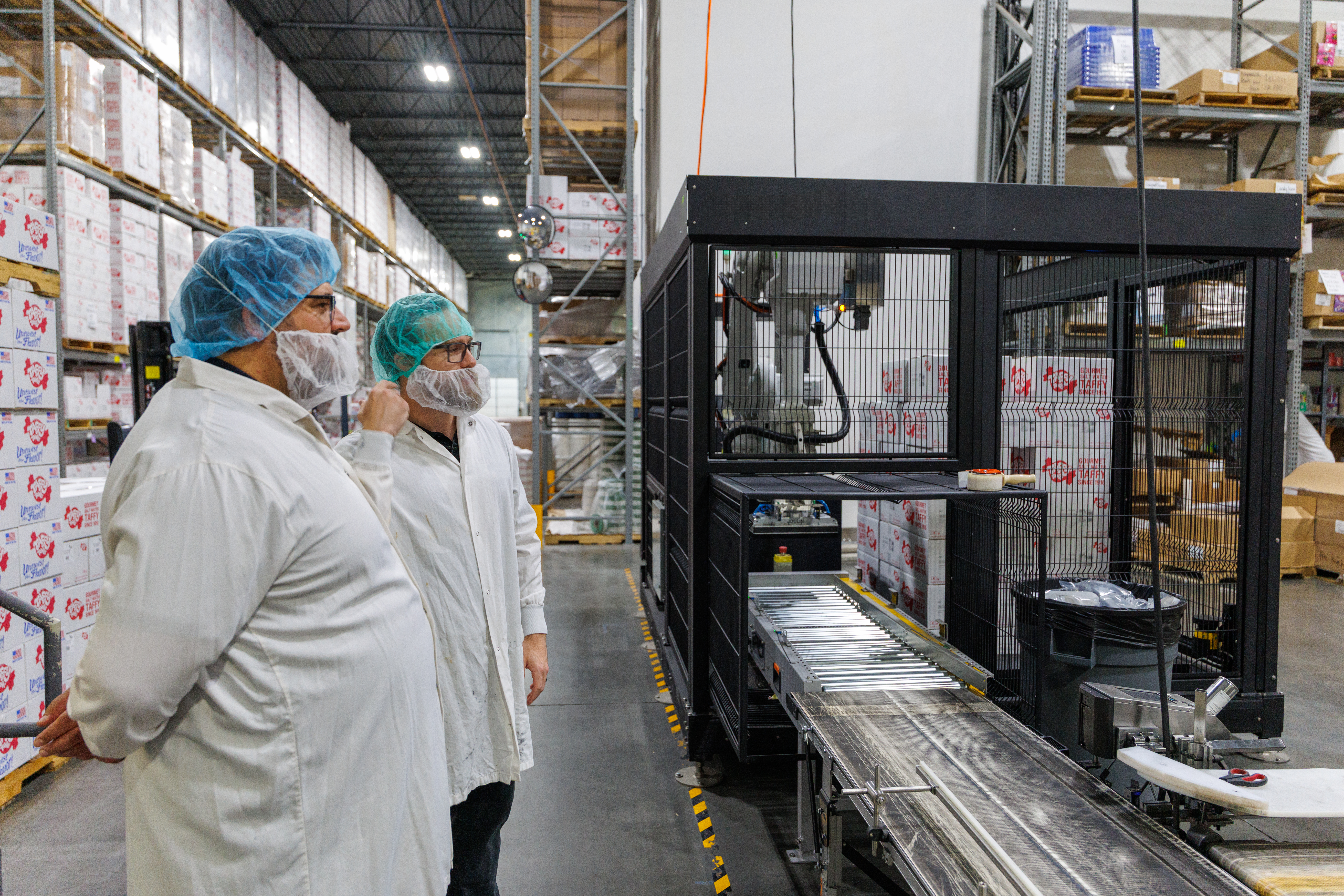 When implementing new technology, unexpected challenges can surface. Shortly after deployment, the Taffy Town team noticed a problem: While they’d moved their employee designated to palletize further upstream, an employee was still needed to manually watch labels and tape boxes, adding a repetitive task instead of removing one.
